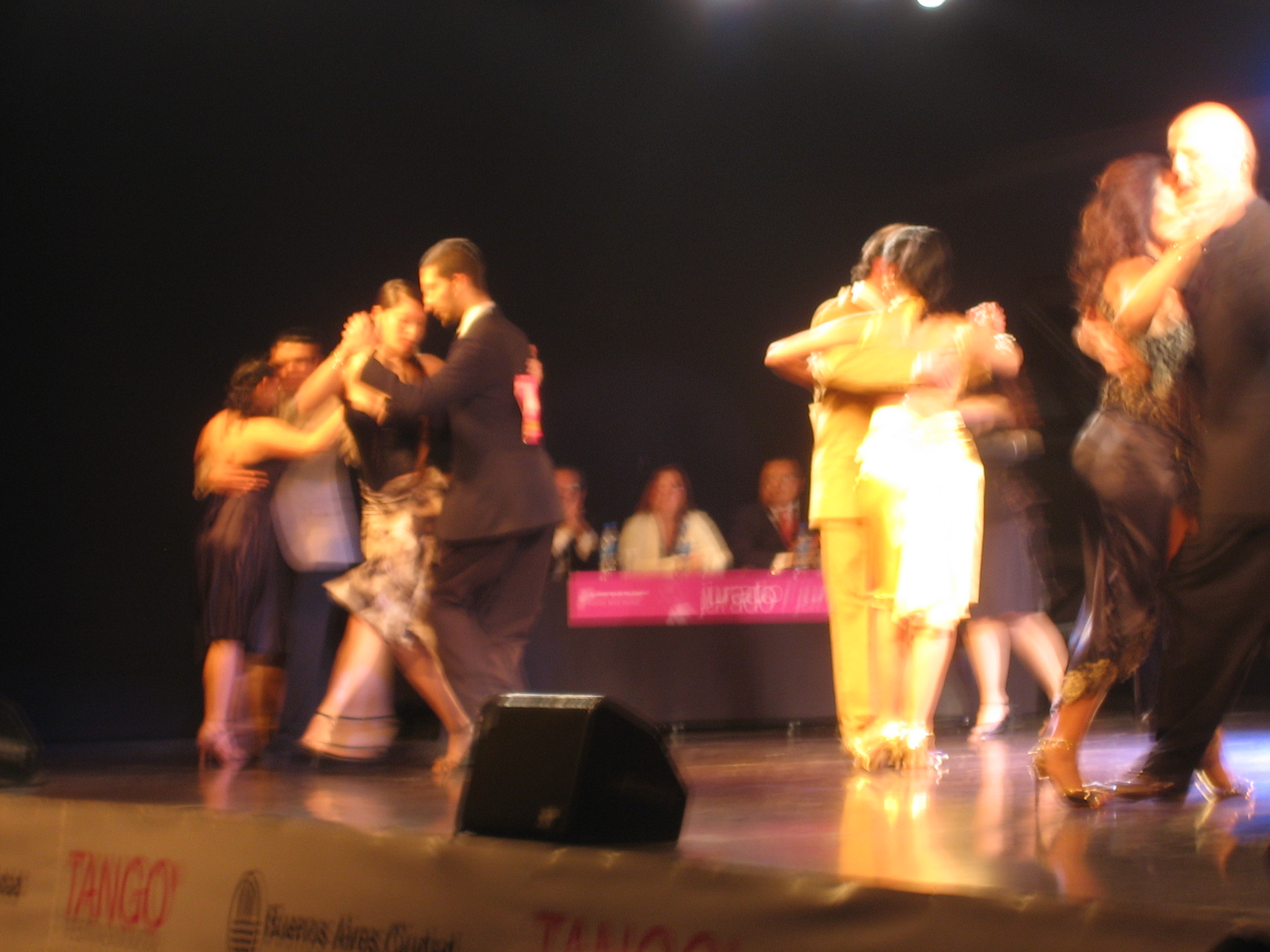 That same evening we watched several rounds of eliminations for the Salon Tango competition. Six or seven couples at a time were announced and danced three tangos on the main stage. The panel of judges (el jurado) you can see off to the left, and behind the dancers, a huge live screen view of the dancing. I liked the couple in the middle of this one:
