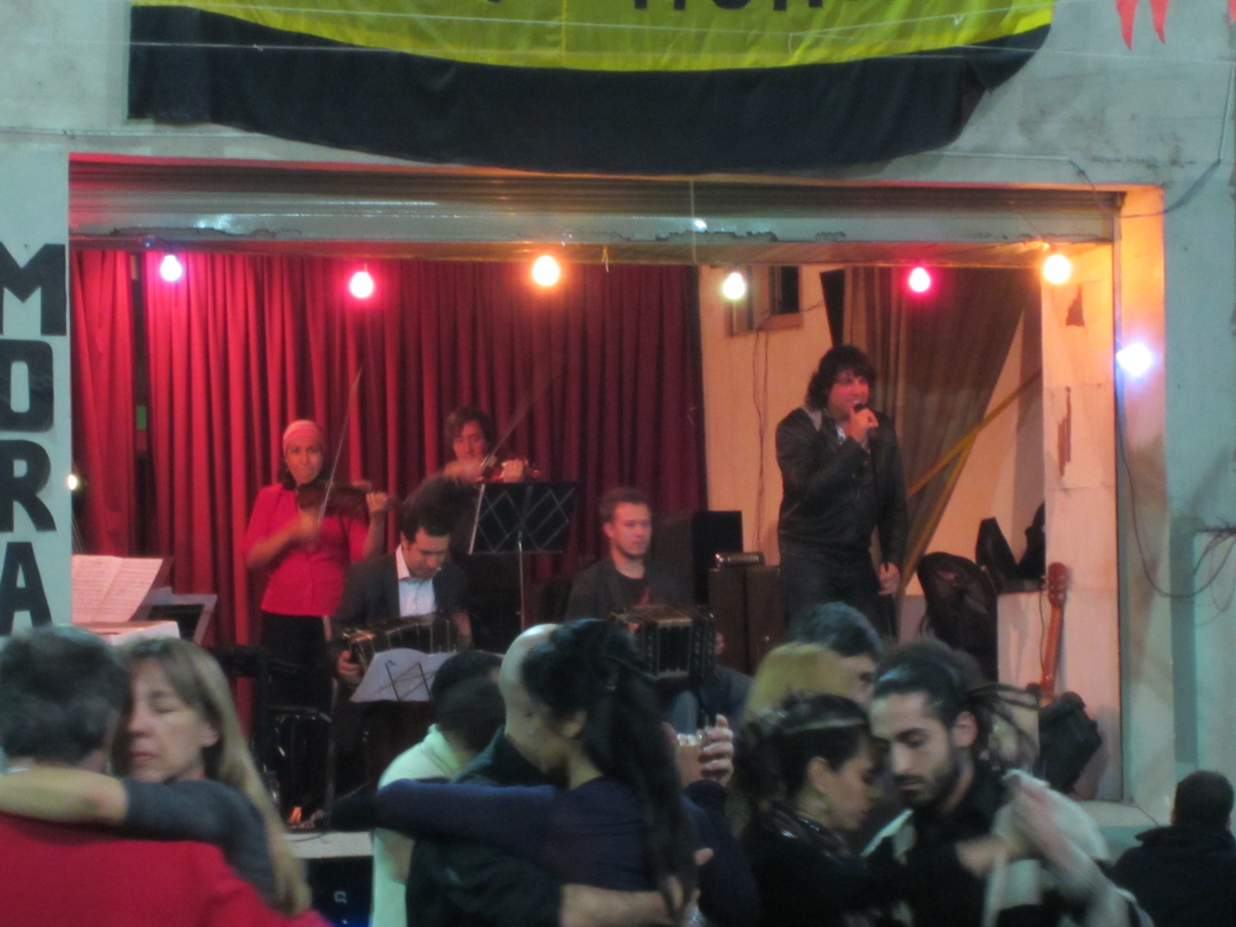 One might wonder how a coherent blog can be written at 4 in the morning after 3 hours of tango class in the afternoon and then dancing from 11 to 3 am. Well, it wasn’t. I’m still working on it, just past midnight now, about 20 hours and another tango class later. We were at La Milonga del Morán, in the Villa Urquiza barrio. How can a dirty, grungy basketball gym be transformed into a sublime Tango experience? The lighting was what you’d expect in an auto repair shop, same goes for the sound system. Sawhorses with recycled formica countertops for tables are, well, reminiscent of 4th of July picnics and Rizzotti’s, a beer garden on Alpine Road in Portola Valley. (We used to ride our horses over there on Saturdays, tie them to the hitch racks under the eucalyptus trees by the creek.) No one was wearing a suit and tie except Ben, who ditched the tie as soon as we sat down (and still the sharpest-looking guy there!). Everybody seemed to know each other. All ages were present, lots of young people. The dance floor was packed, meaning it took about four songs (10 minutes or so) to make a complete circuit around. The phenomenal sound of Sexteto Milonguero, followed by a Tango performance by Gabriel Missé and Analía Centurion, added to the amazing wabi-sabi atmosphere. I mean, how can you not have a great time, despite the dismal decayed environment, while watching two of the most highly acclaimed tango dancers in the world?