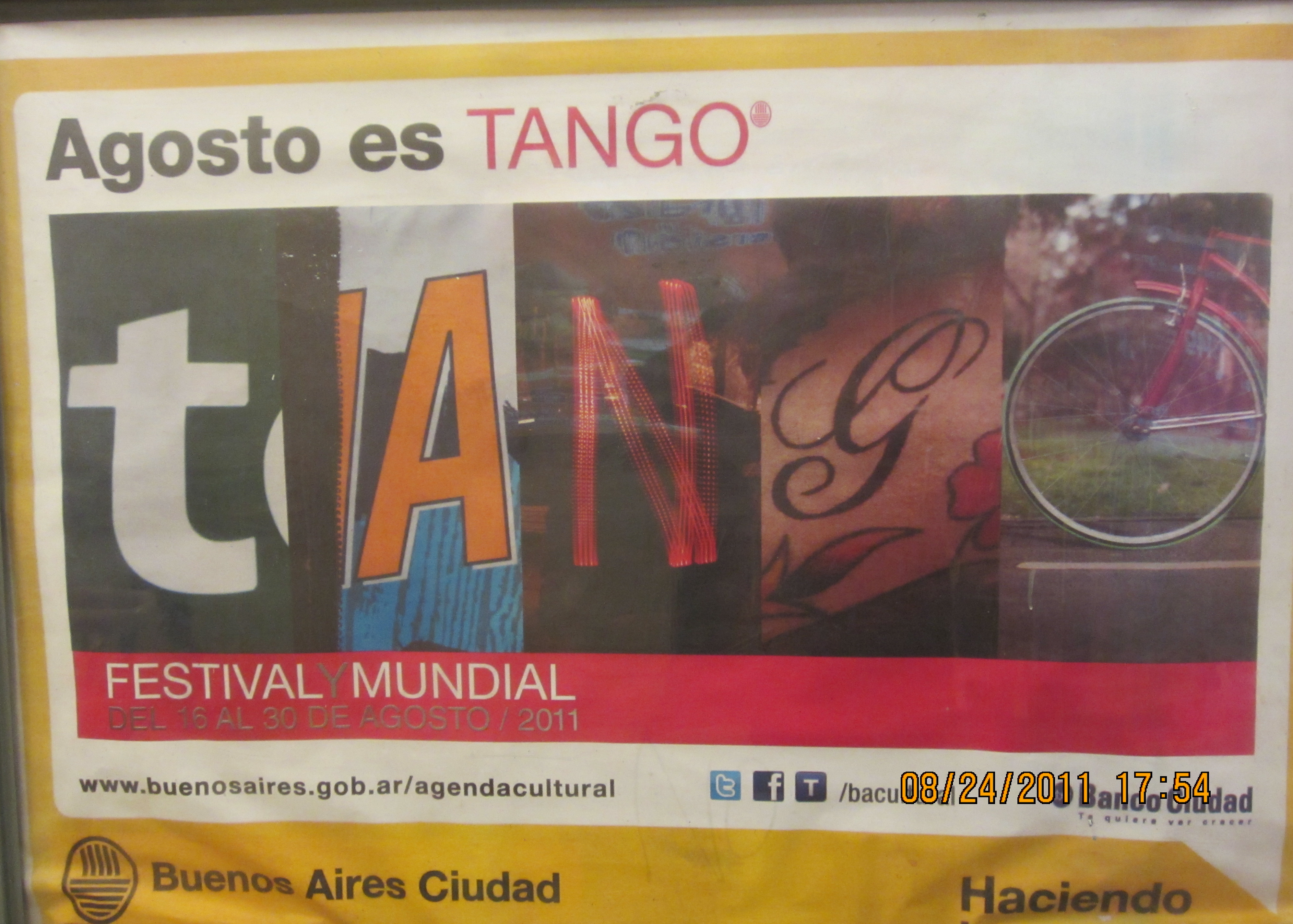 The Buenos Aires Tango Festival and World Cup runs from August 16 – 30. Billboards and ads on TV are all over town and down in the subte too.