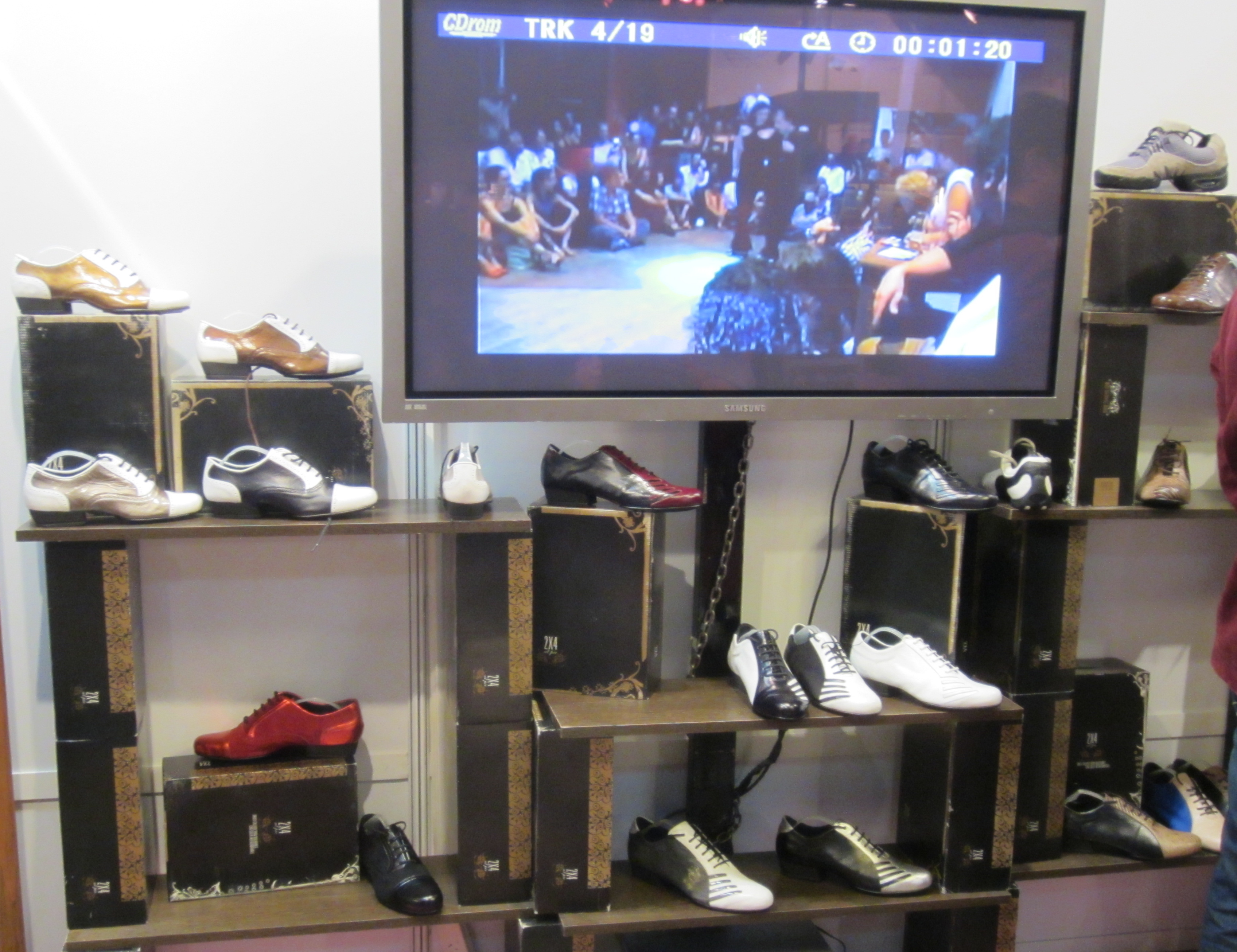 So many shoes, so little time! No, I’m not getting a kickback for the free PR. I wish!! And for the guys, great tango shoes and electronic entertainment while you try them on: