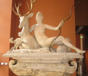 The water spilling over the edge and into the still pool is just lovely. Above them four nymphs are circling, symbolically representing the earthly sphere, with its four directions and four colors of humankind. The figures hold aloft a circular band with the 12 symbols of the Zodiac. Pretty cosmic stuff! You might say it prefigured the hippie era. Farther on is a long strip of green lawn edged with shade trees and dotted with sculptures.