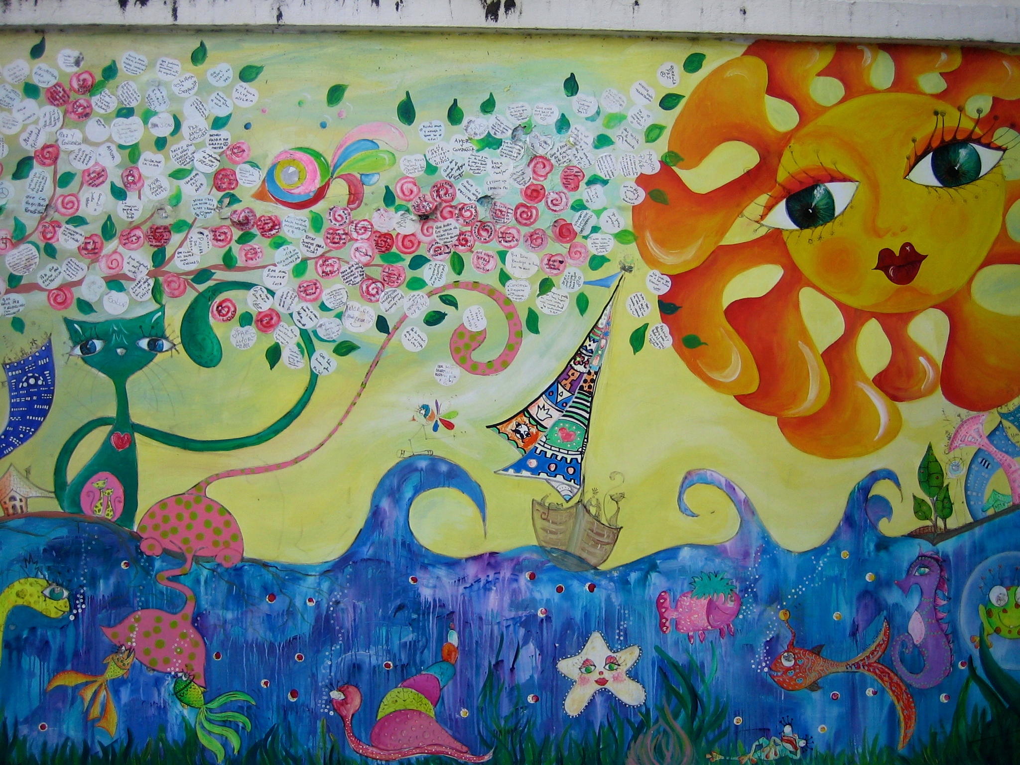 At the upper left of the above mural a verse from “Doña Primavera,” a poem by Chilean poet Gabriela Mistral, is just barely visible.